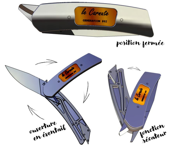Couteau pliant avec ouverture unique en éventail et une fonction sécateur intégrée.